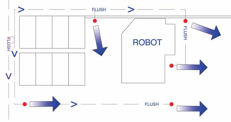 Daritech now offers a complete flush system for small areas around robot milking equipment. Each main valve can feed three to eight small flush valves that feature interchangeable discs to precisely control flow and direction. Keep your waiting areas, cross overs, sort and fetch areas consistently clean with reduced labor.