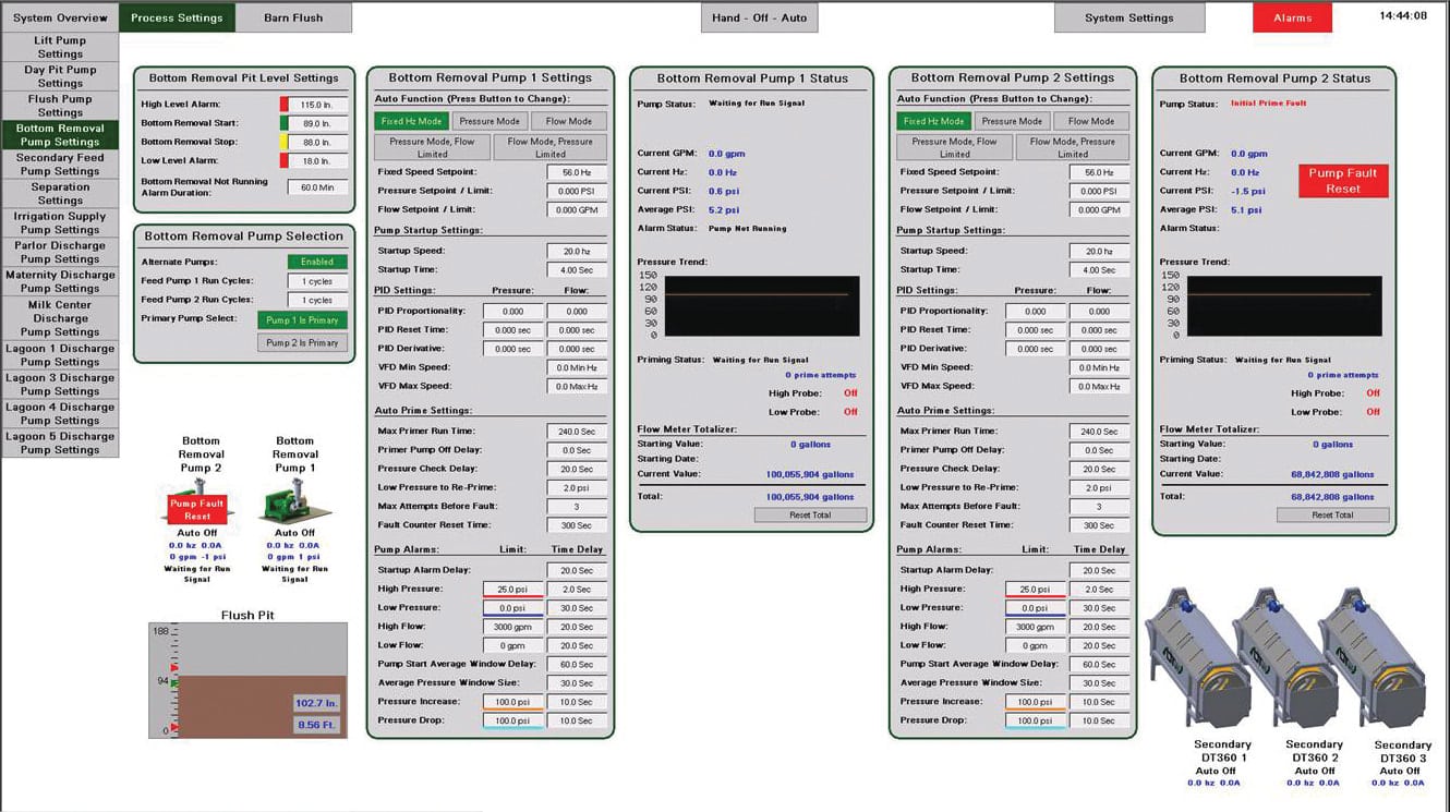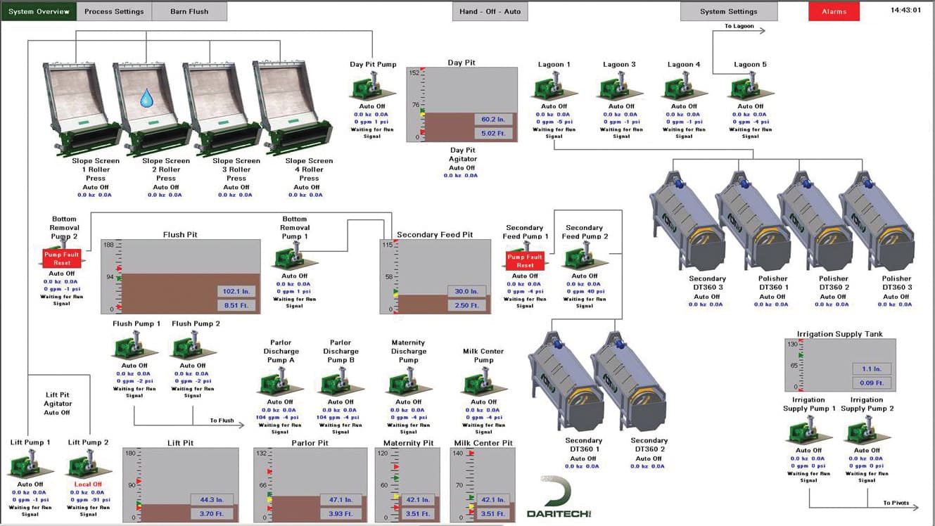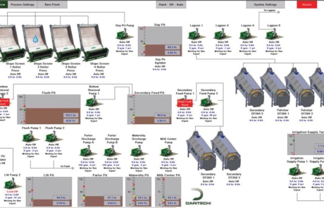 With our in-house engineered industrial PLC touch screen interfaces, we can provide high end control for your manure management systems. We are able to provide rich features such as mobile device monitoring, remote control, text messaging, and remote technical support.